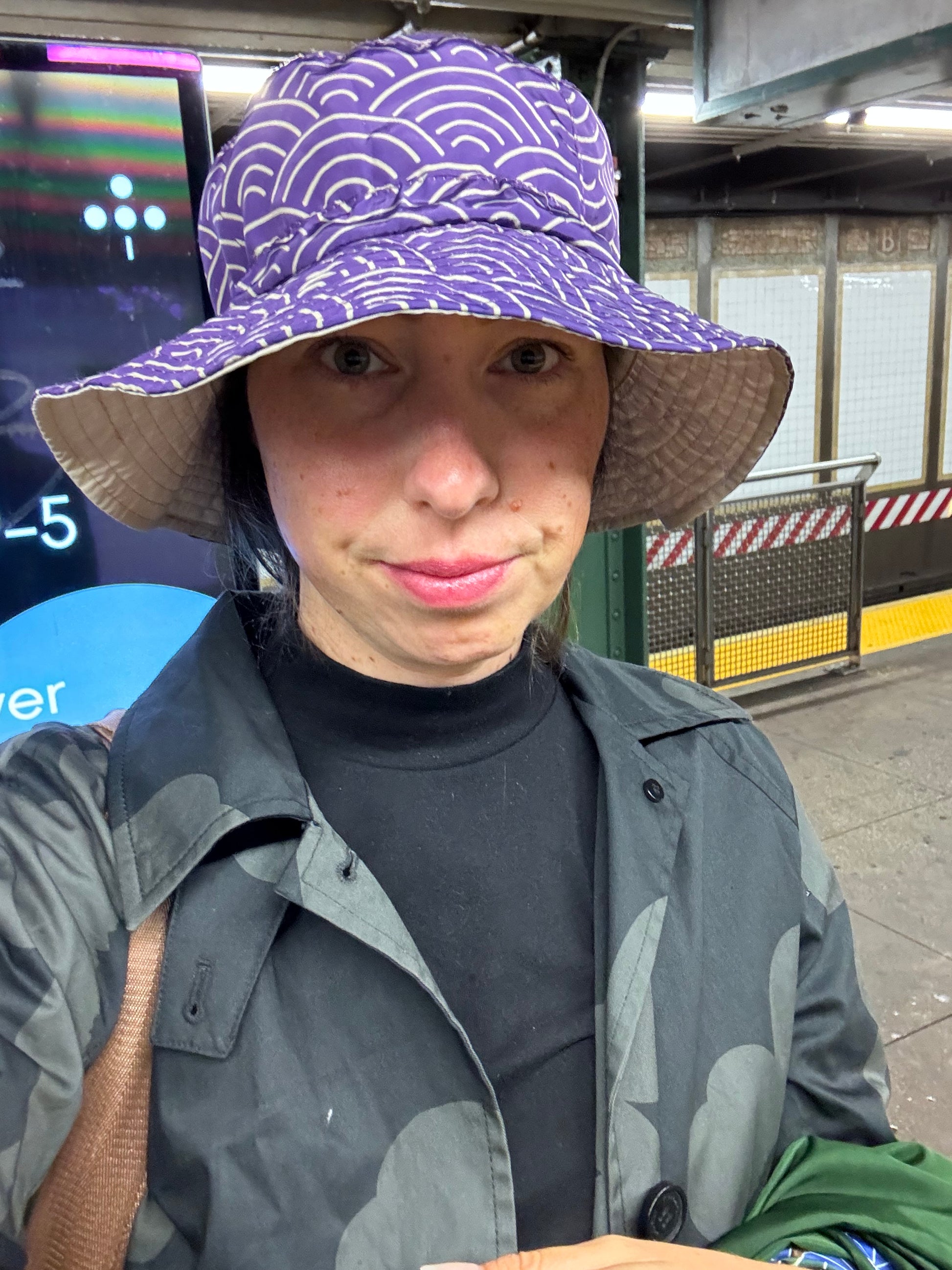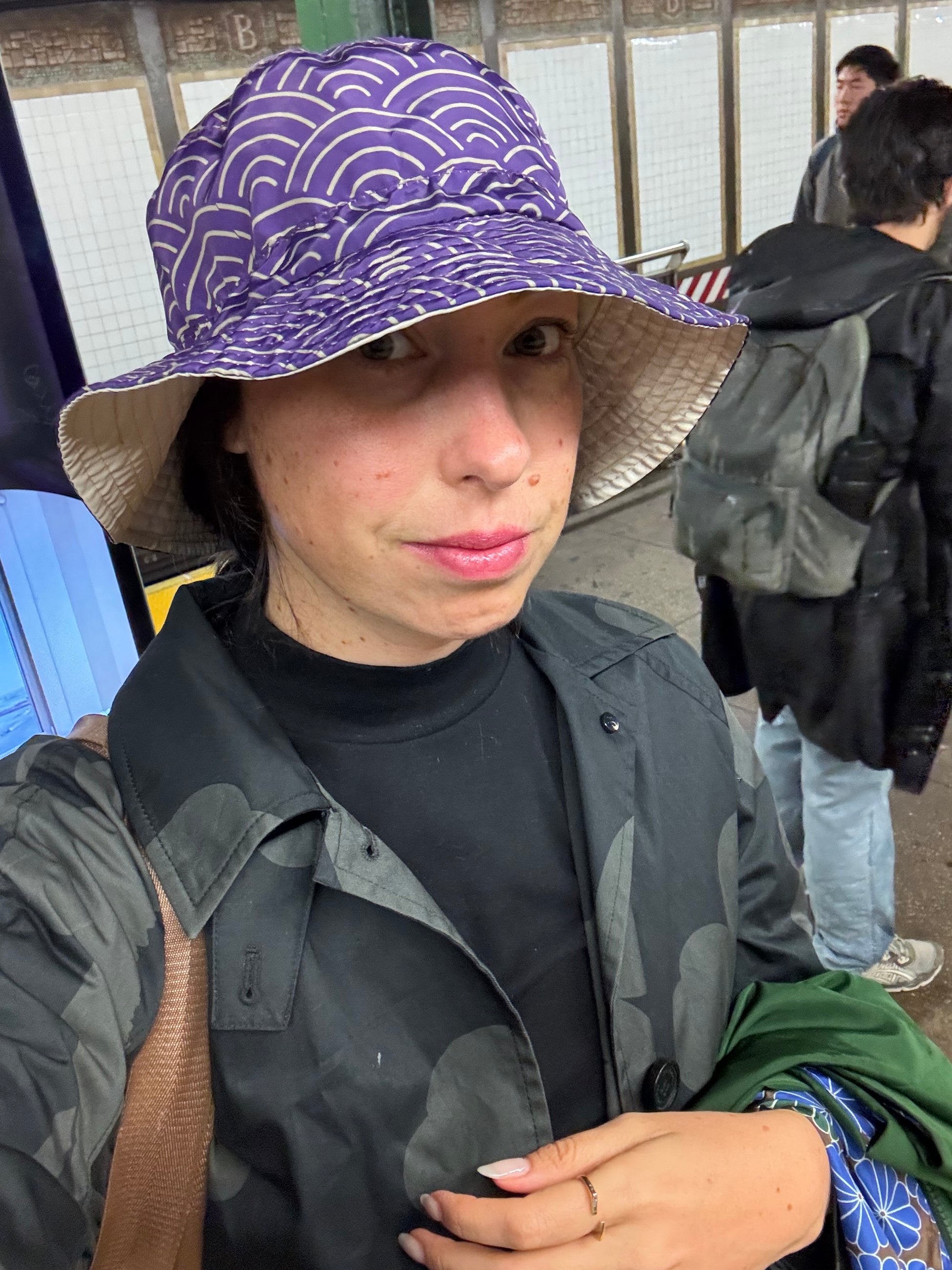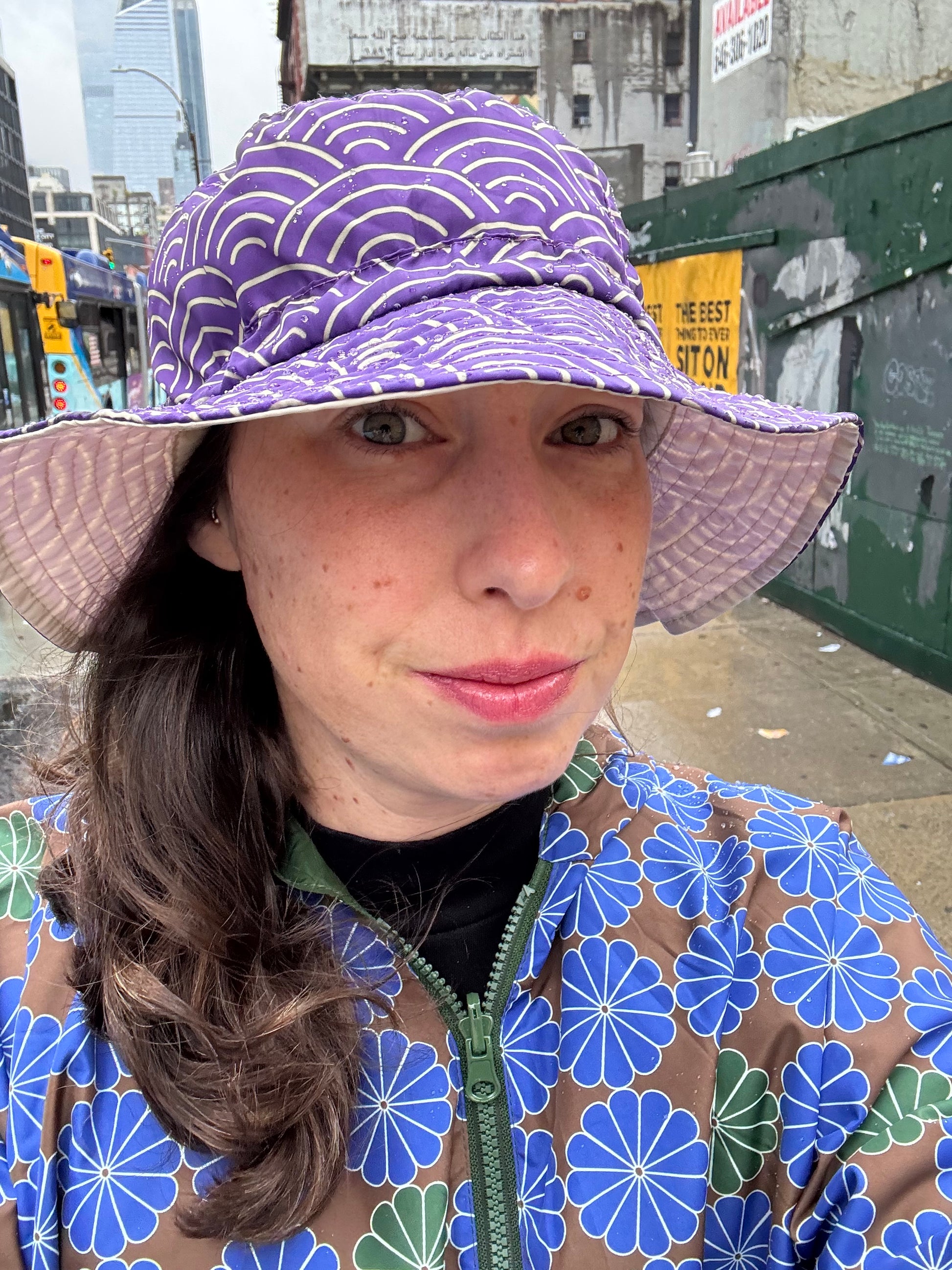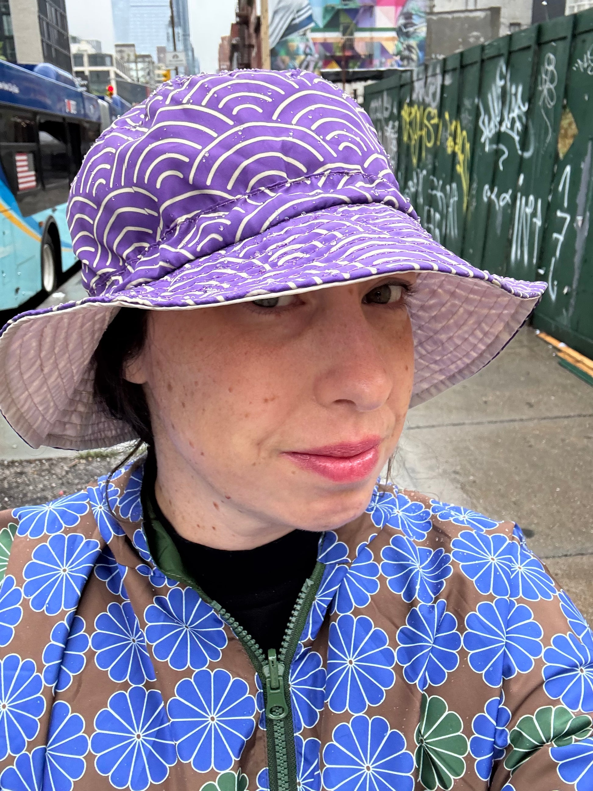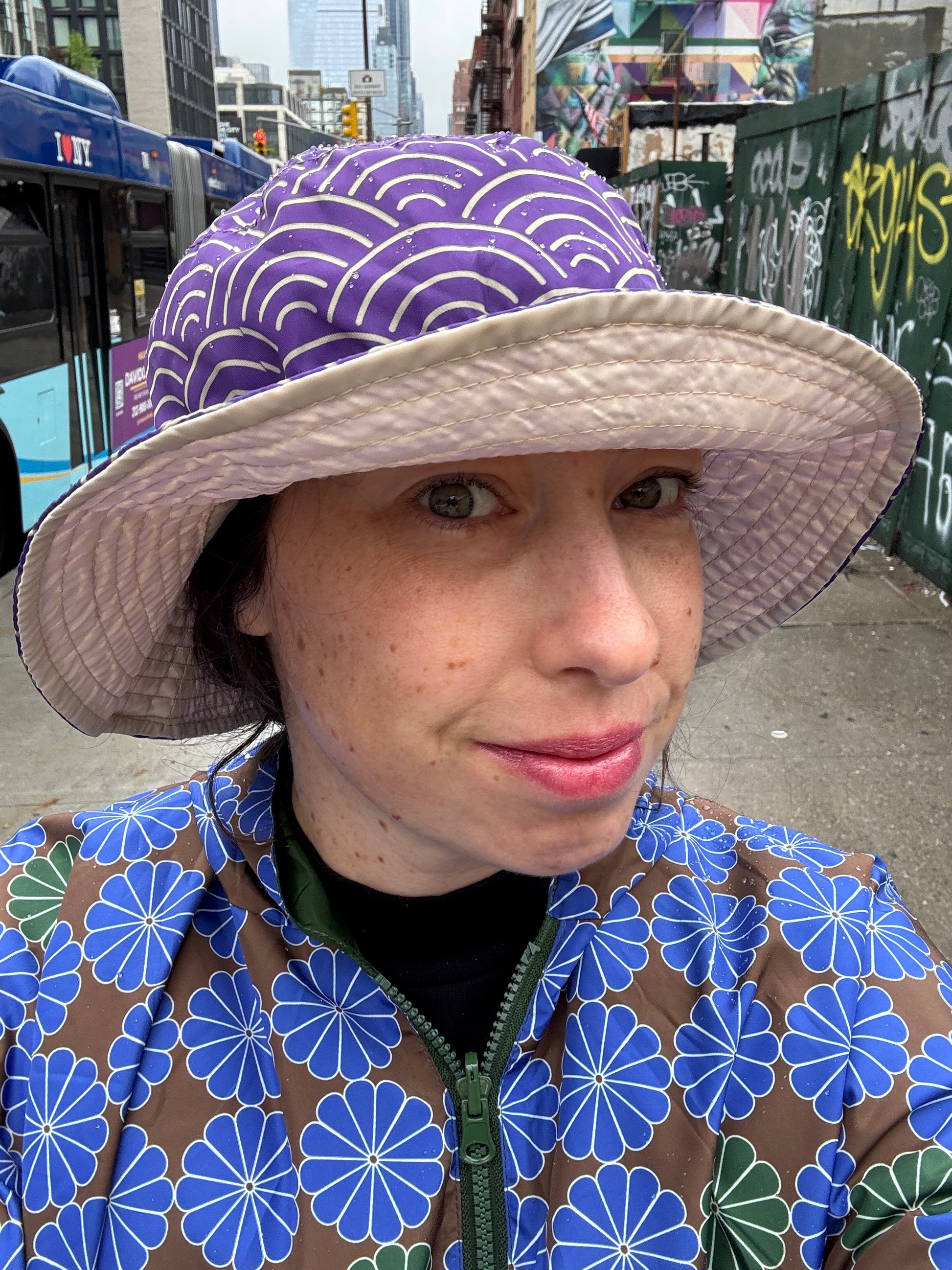 Colors: The Tokyo Purple Bucket Hat is reversible, with a purple side featuring Japanese-inspired half-circle shapes and a solid nude color on the other.