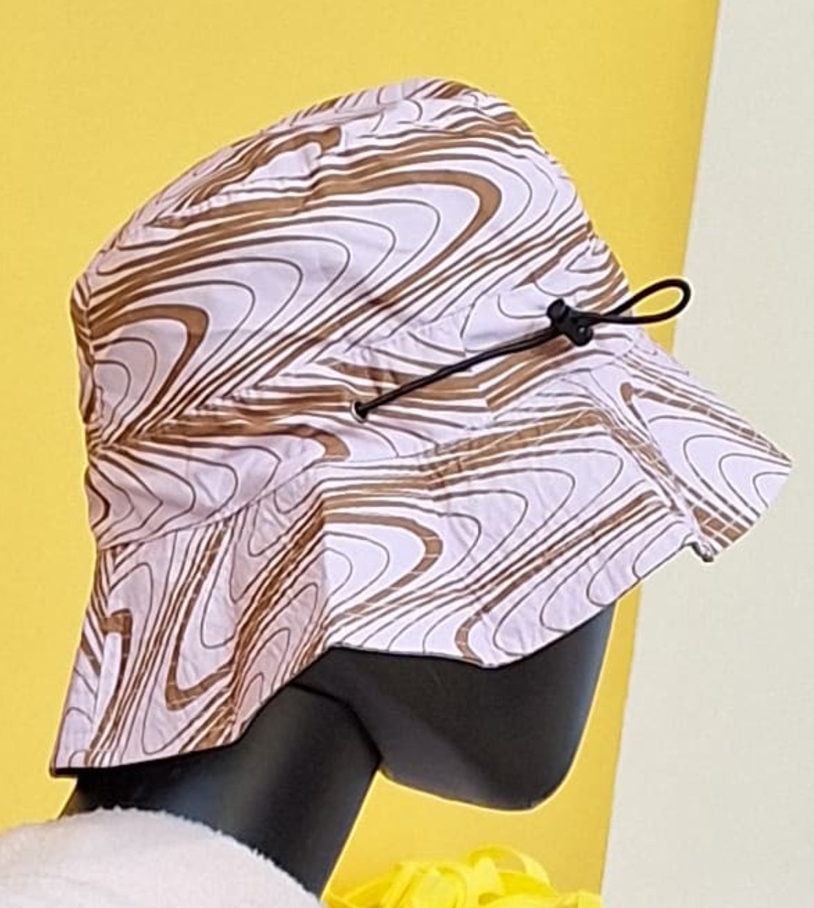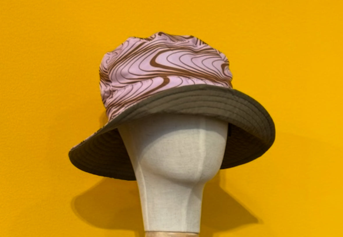 Colors: The Wavy Pinky Bucket Hat is reversible, featuring a pink background with nude and brown wave patterns on one side and solid brown on the other.