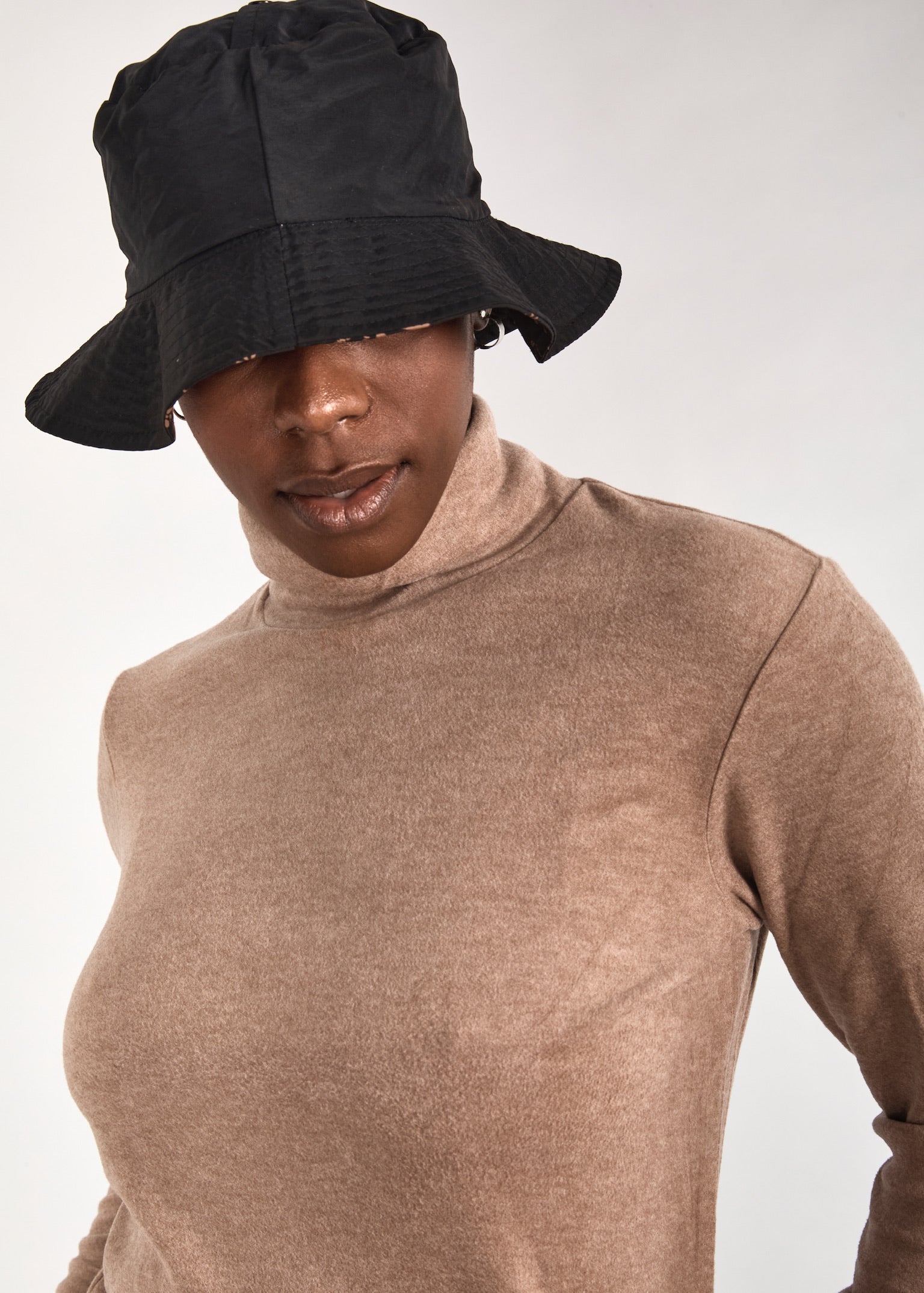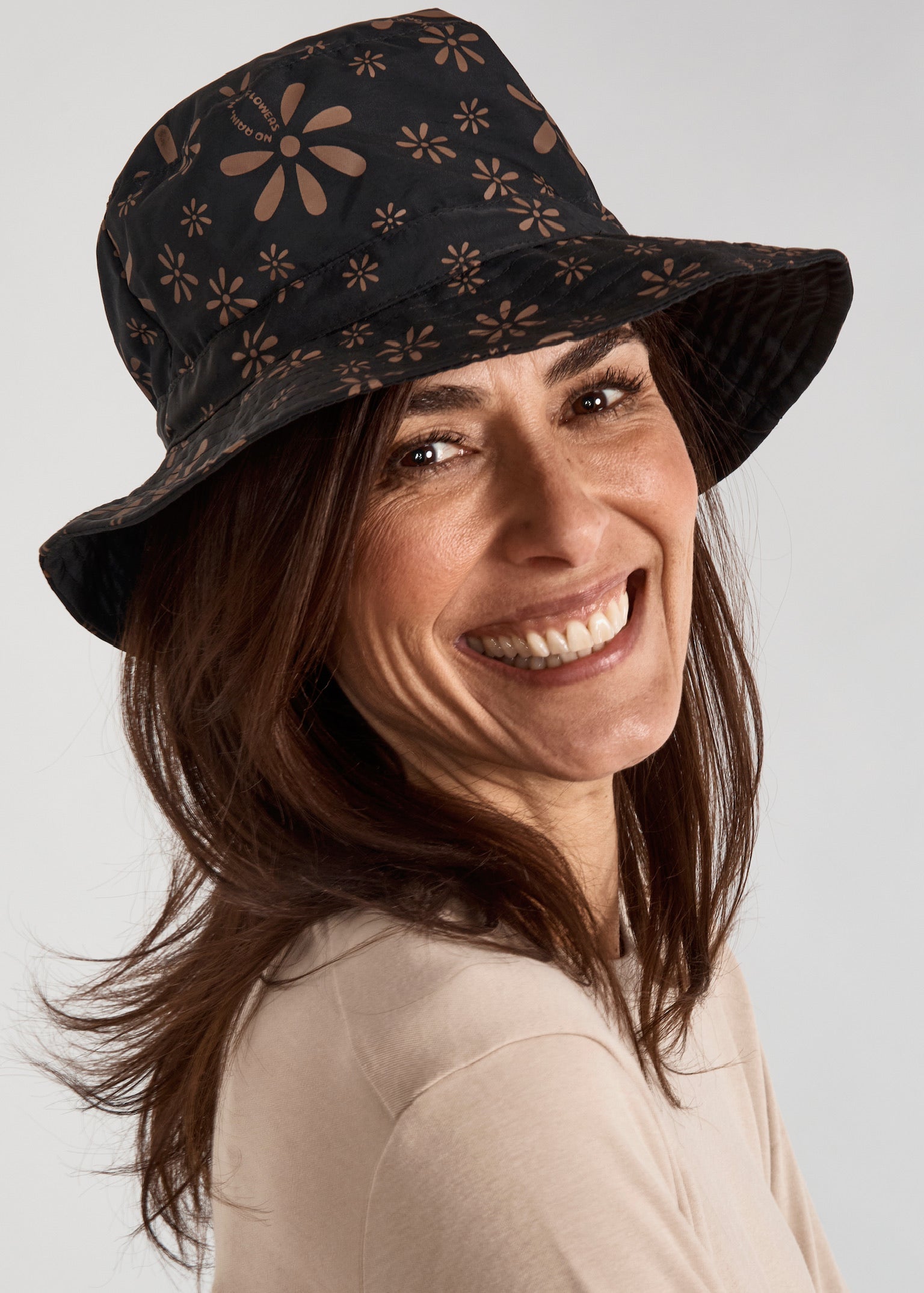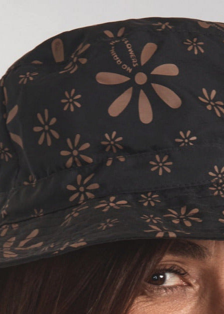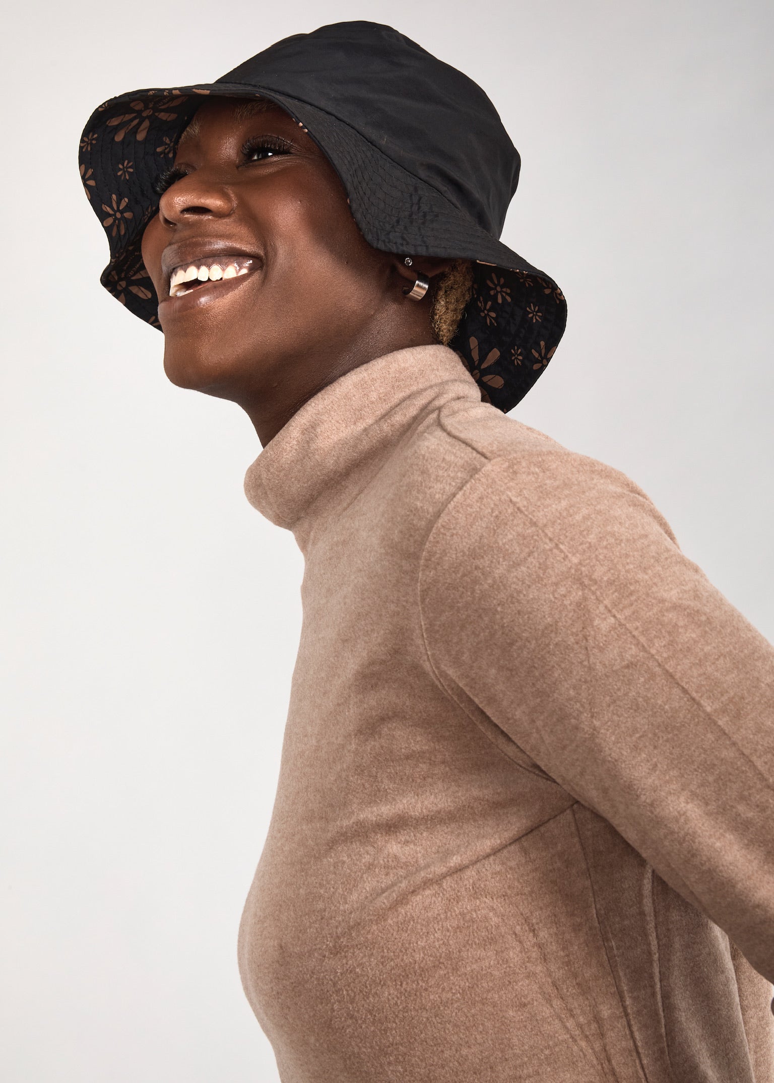 Colors: The Timbo Bucket Hat is reversible, with a golden brown floral print on one side and sleek solid black on the other.