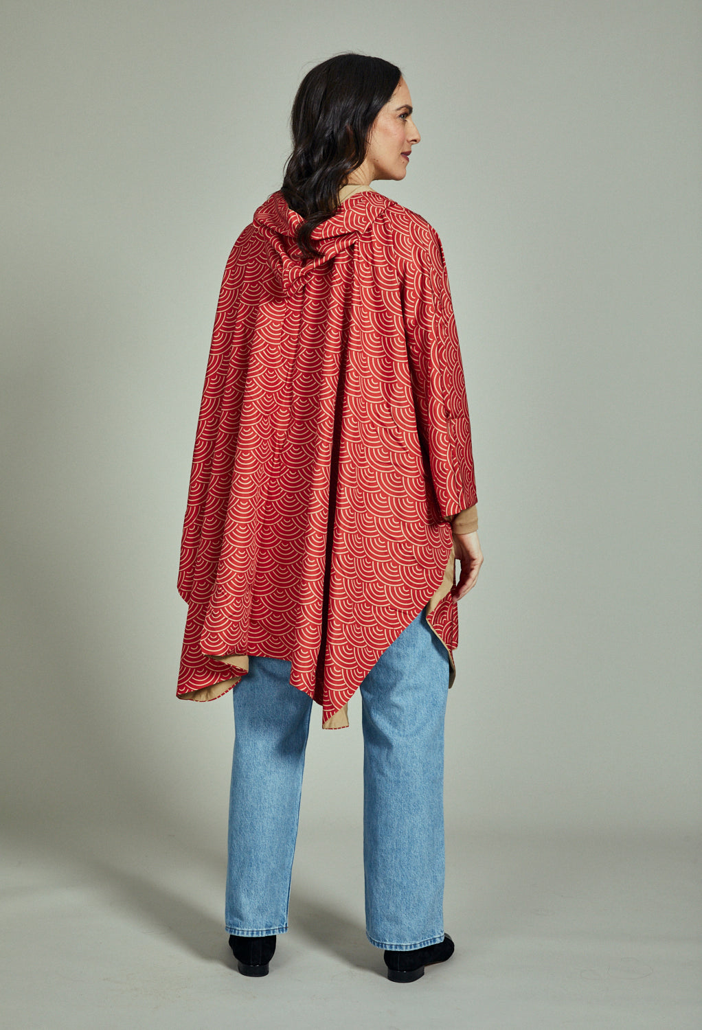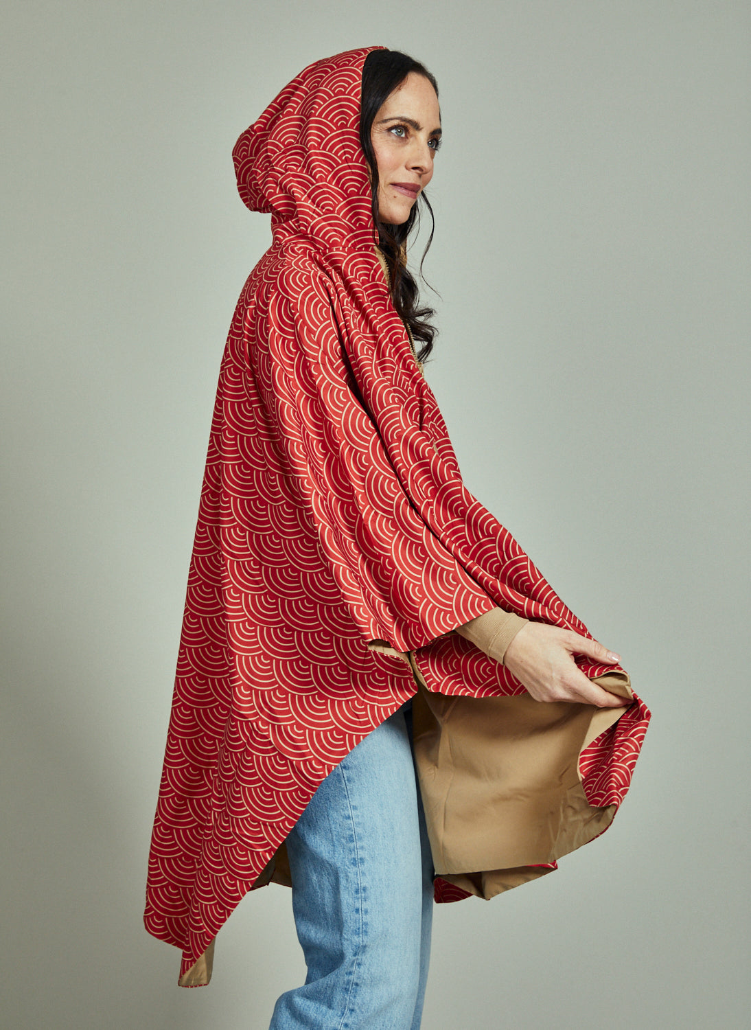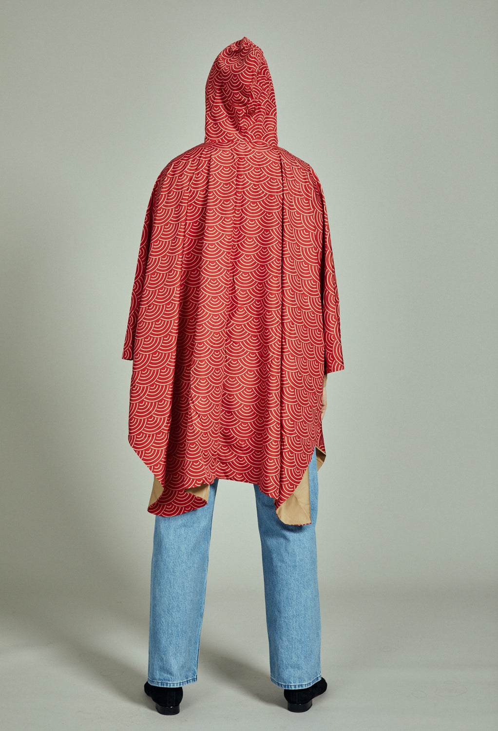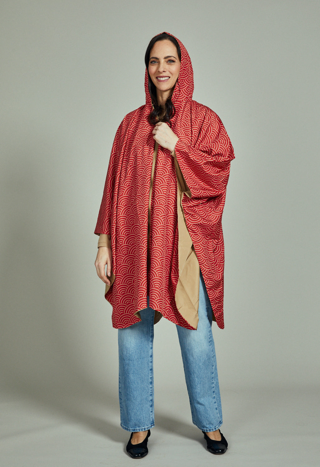 Colors: The Tokyo Red Poncho features a Japanese wave pattern on one side with a red background and beige waves, while the reverse side is a solid color.