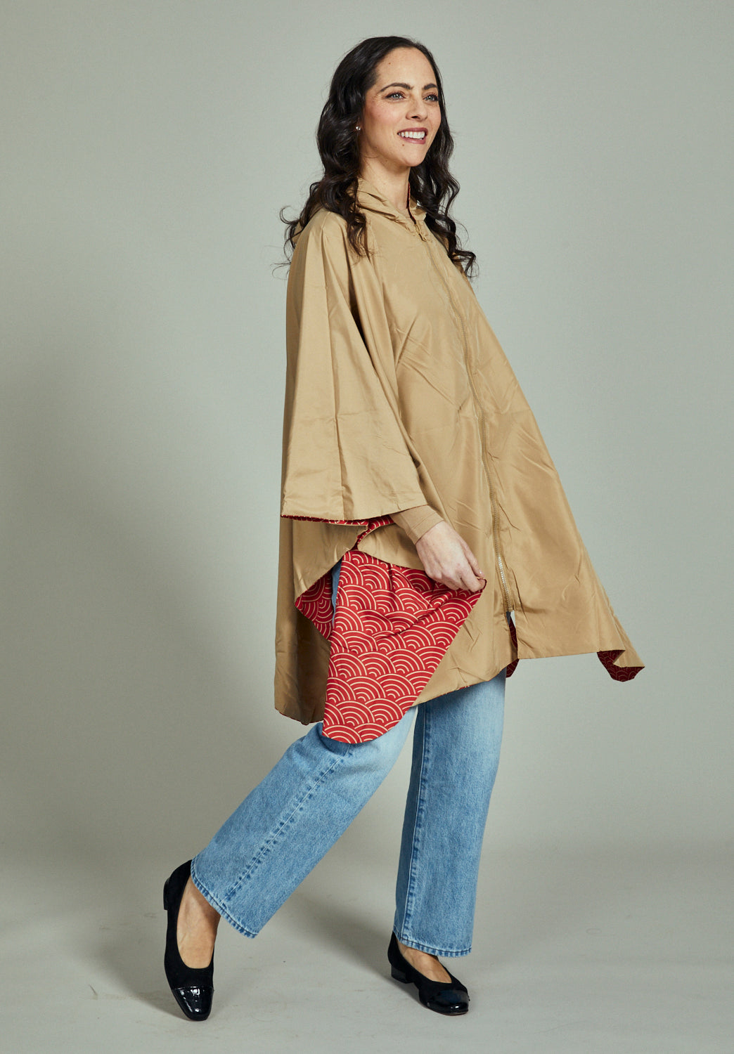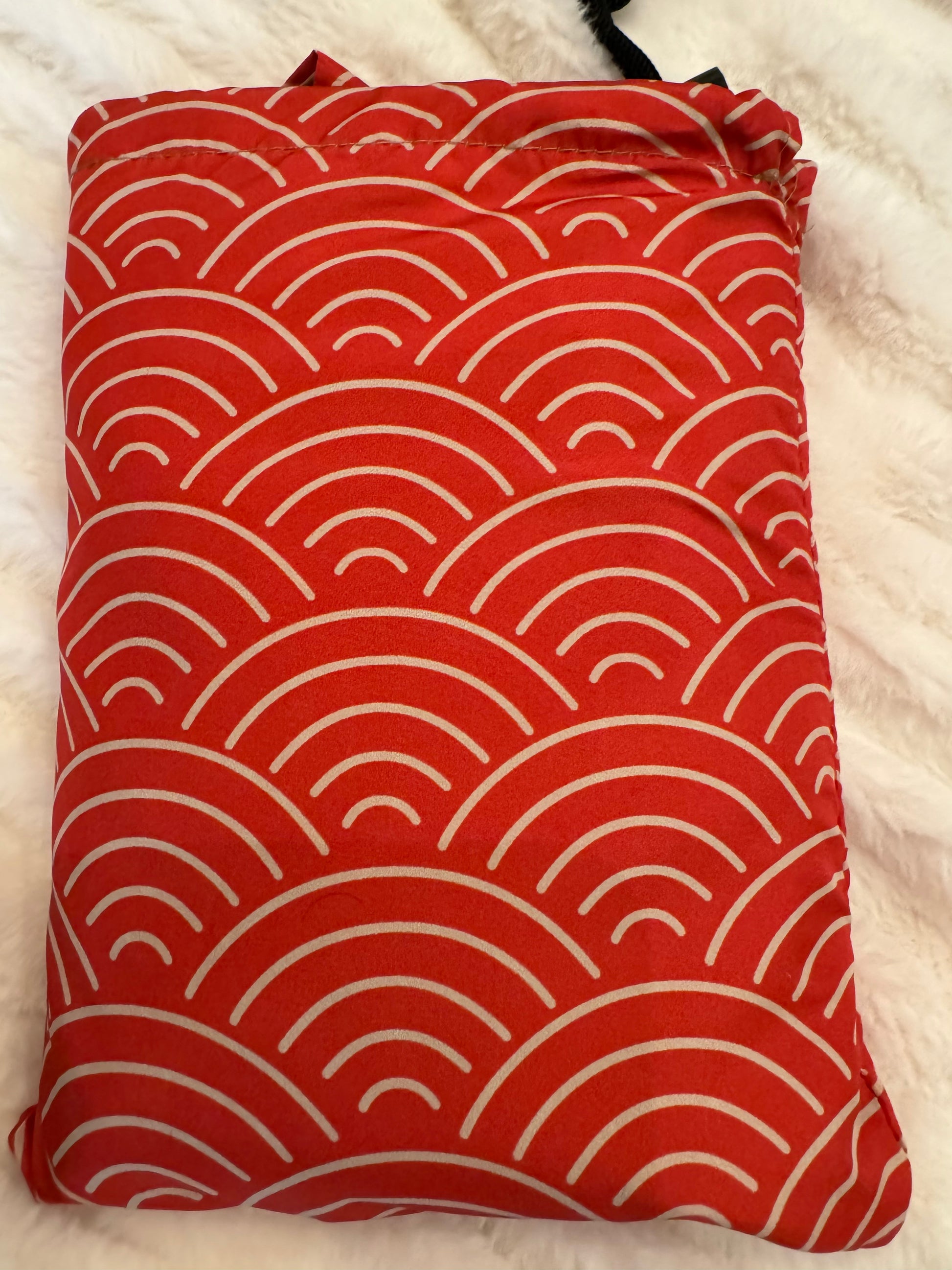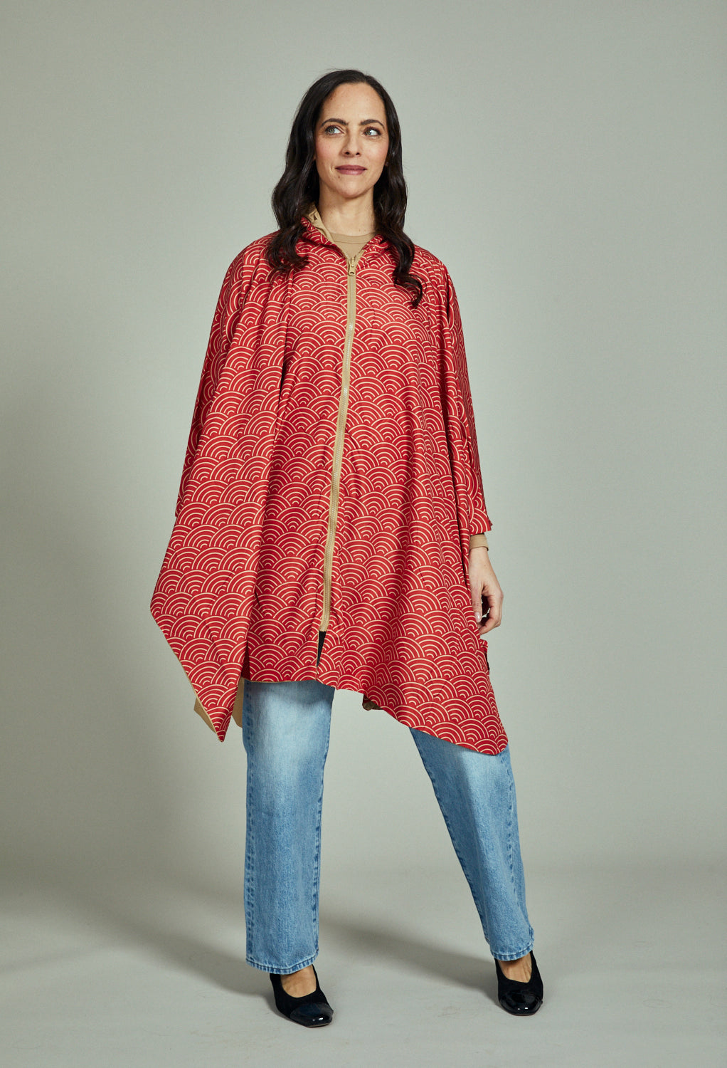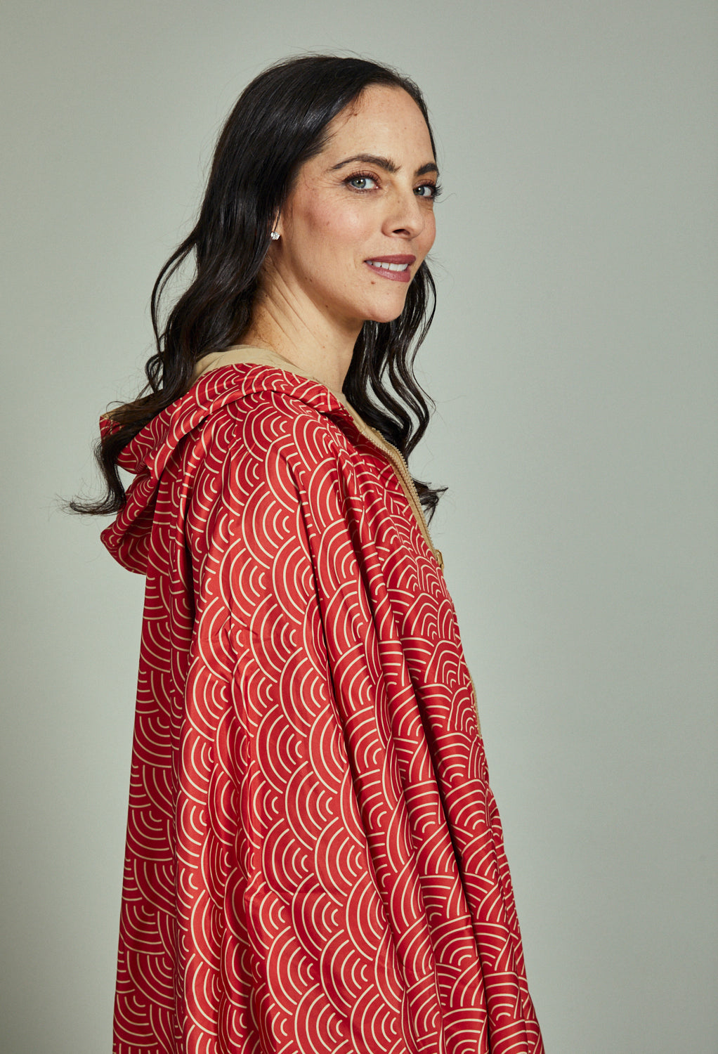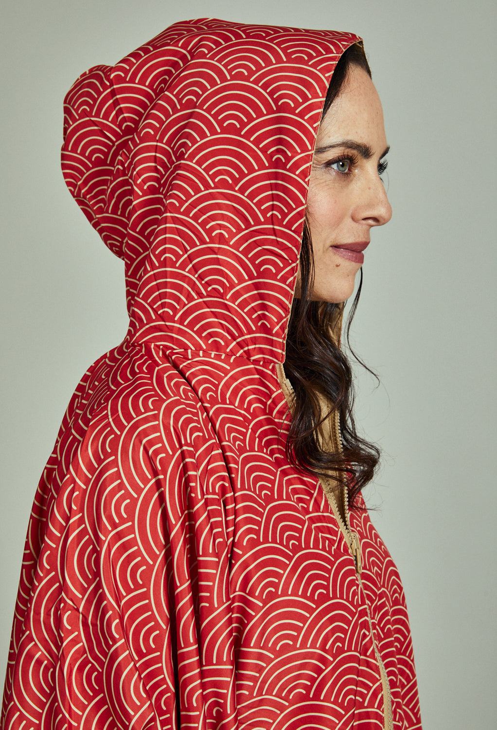 Colors: The Tokyo Red Poncho features a Japanese wave pattern on one side with a red background and beige waves, while the reverse side is a solid color.