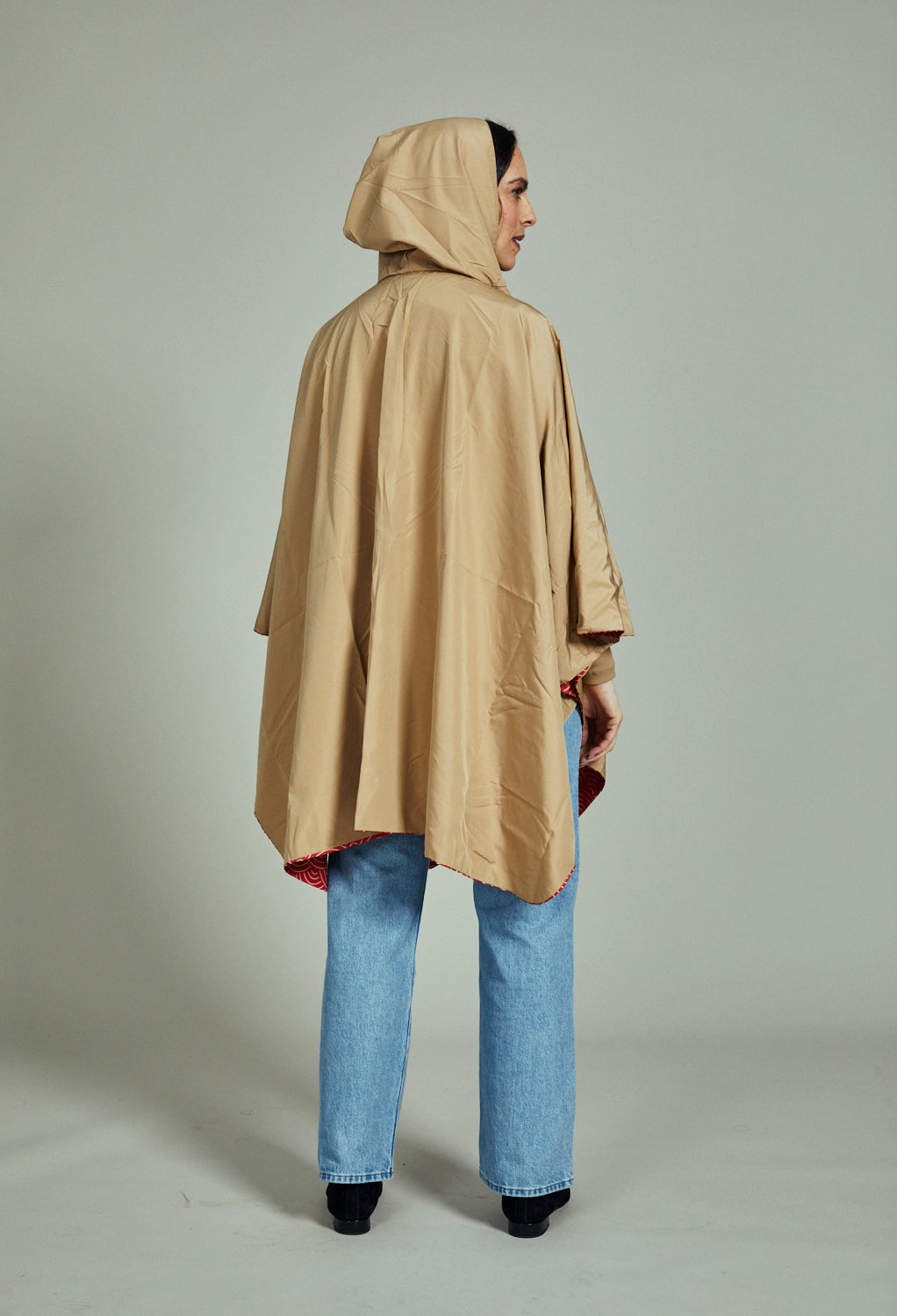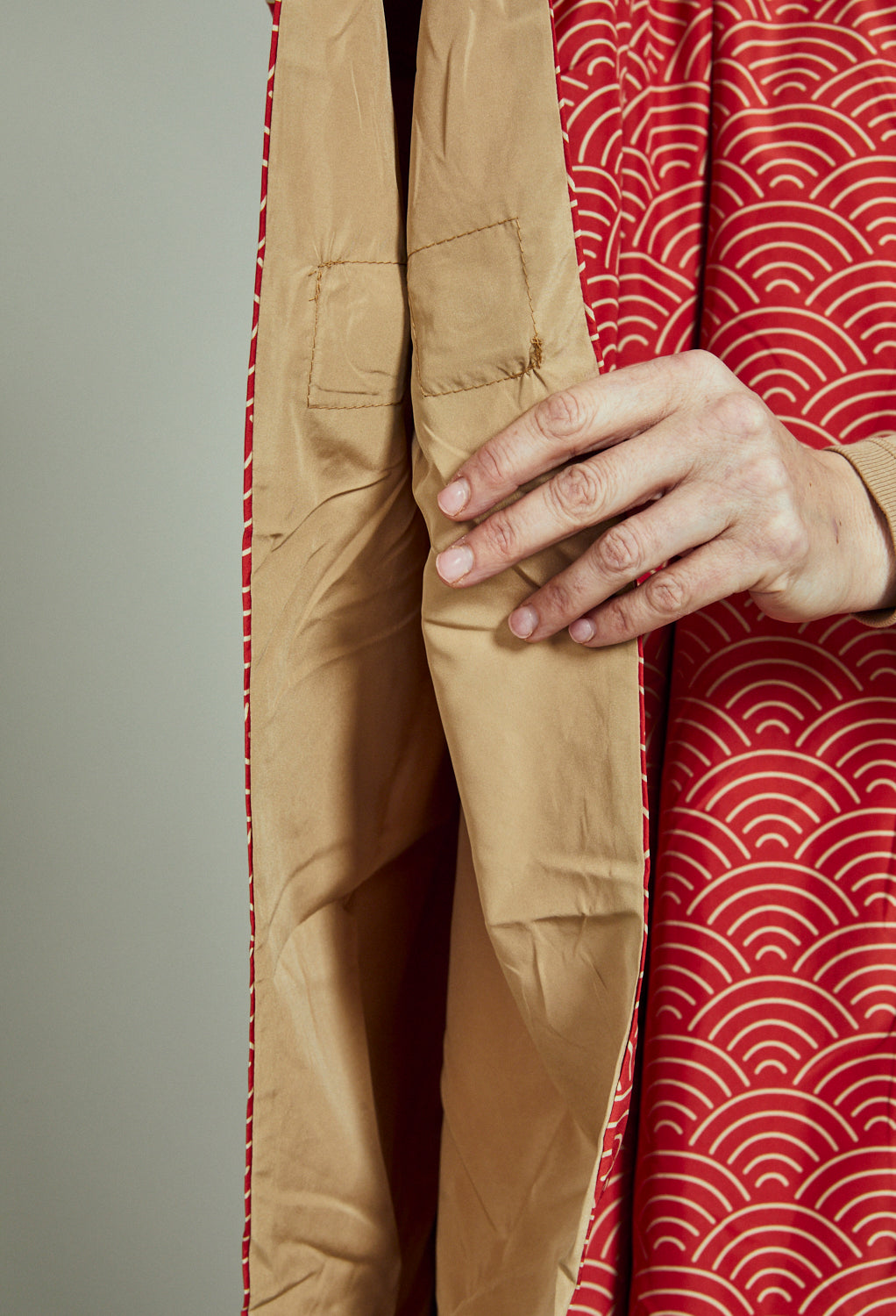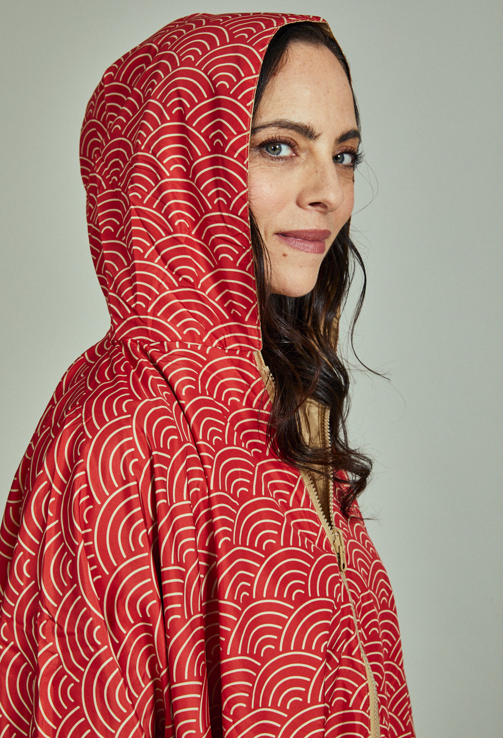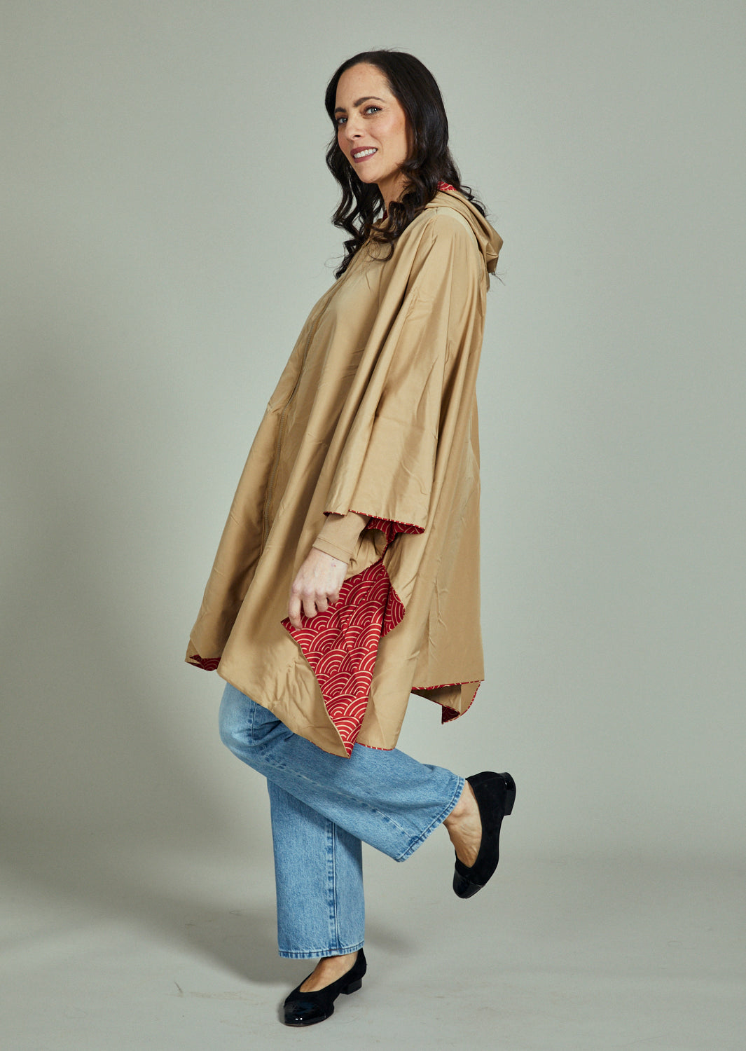 Colors: The Tokyo Red Poncho features a Japanese wave pattern on one side with a red background and beige waves, while the reverse side is a solid color.