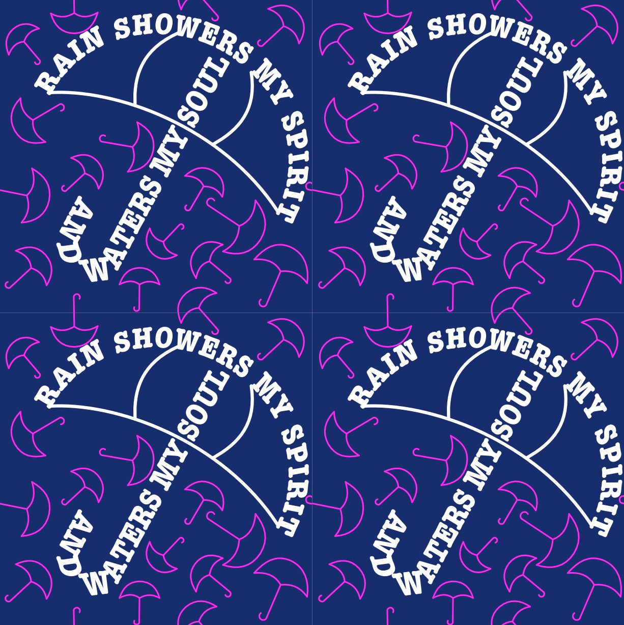 Colors: The Umbrella Blue Poncho is reversible, featuring a deep blue side with white umbrellas created from the text of the phrase "Rain showers my spirit and waters my soul," along with small purple umbrellas scattered throughout. The reverse side is sleek black, complemented by a matching black zipper for a polished and complete look.