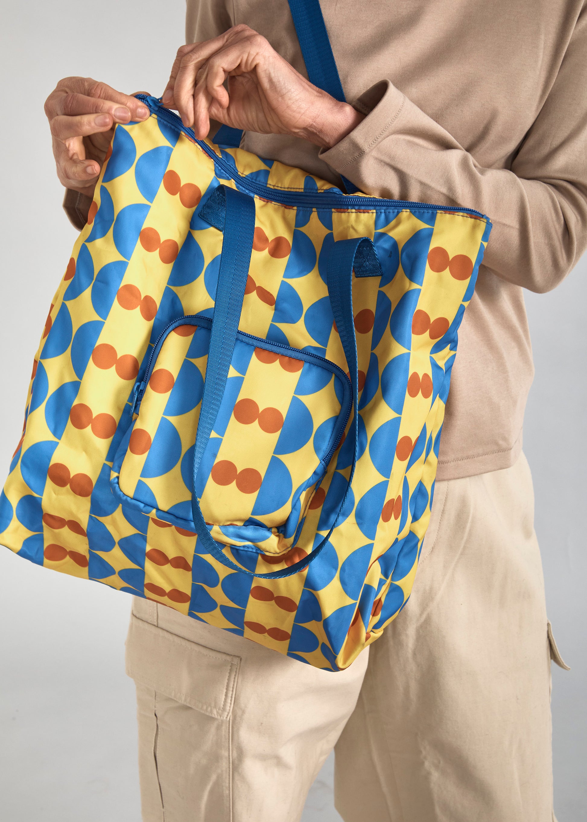 Colors: The Retro Tote Bag features alternating yellow and blue stripes, with orange circles on the yellow sections and playful star-like shapes on the blue. The vivid, three-color combination creates a fun and energetic design.